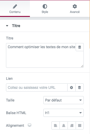 Vous définissez simplement le type de titre H grâce au champ Balise HTML prévu à cet effet.