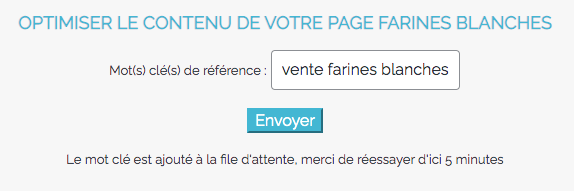 Tapons le mot clé Vente farines blanches et cliquons sur Envoyer. L’outil va analyser la demande pendant quelques minutes. Il faut laisser la fenêtre du navigateur ouverte et recliquer sur Envoyer quelques minutes plus tard.