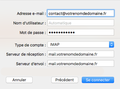 Sélectionnez IMAP en type de compte. Pour les serveurs de réception et d’envoi, notez mail.votrenomdedomaine.fr