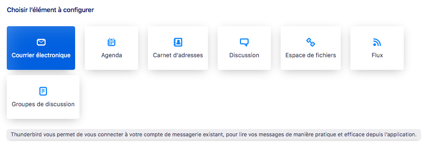 À l’ouverture de Thunderbird, sélectionnez Courrier électronique pour ajouter une nouvelle adresse mail.