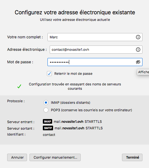 Thunderbird va détecter automatiquement la configuration des serveurs mails. Vérifiez cependant que la case IMAP est bien cochée.