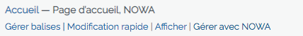 Survolez la page qui vous intéresse, un menu apparaît sous le nom de la page. Pour modifier son contenu, cliquez sur Gérer avec Nowa.