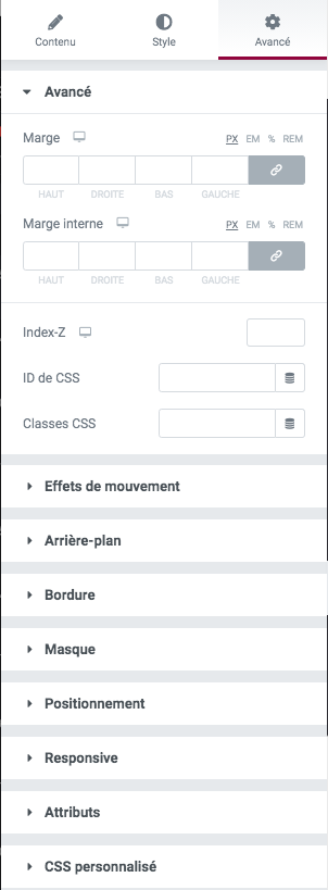 À l’image des modules, les options de configuration d’une section se décomposent en 3 onglets Mise en page / Style / Avancé.