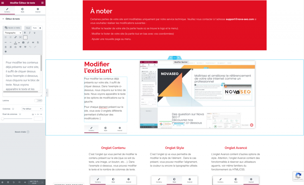 Pour modifier les contenus déjà présents sur votre site, il suffit de cliquer dessus. Dans l’exemple ci-dessous, nous cliquons sur le bloc de texte. Nous voyons apparaître le texte et les options de modifications sur la gauche.